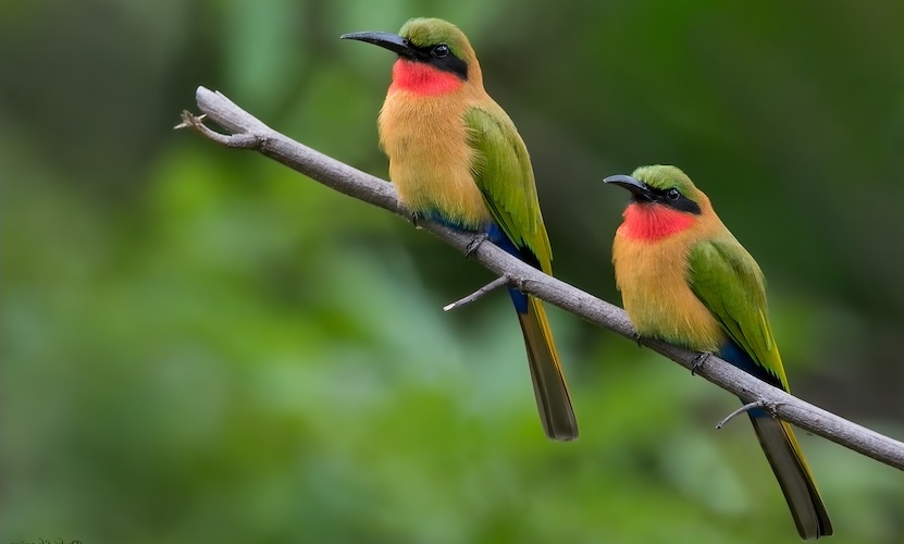 Species AccountA pretty, medium-sized bee-eater with a red throat and a blue lower belly. Also note the black face mask, green upperparts, and pale orange... -