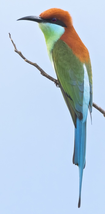 Species AccountLarge and gorgeous bee-eater with a mostly carmine body, and blue-green head and belly. The central tail feathers are elongated. -