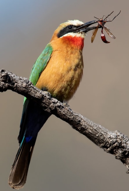 As their name suggests, bee-eaters predominantly eat flying insects, especially bees and wasps, which are caught in the air by flights from an open perch. The stinger is removed by repeatedly hitting and rubbing the insect on a hard surface. During this process, pressure is applied to the insect thereby extracting most of the venom.