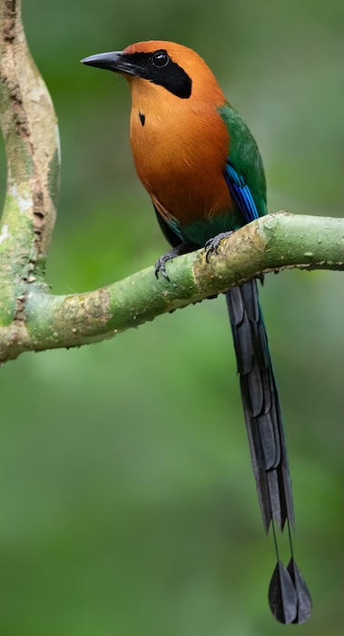 Species AccountLarge forest-dweller that likes to sit motionless. Head and breast rufous-orange with black mask and breast spot. Green back and long tail. -