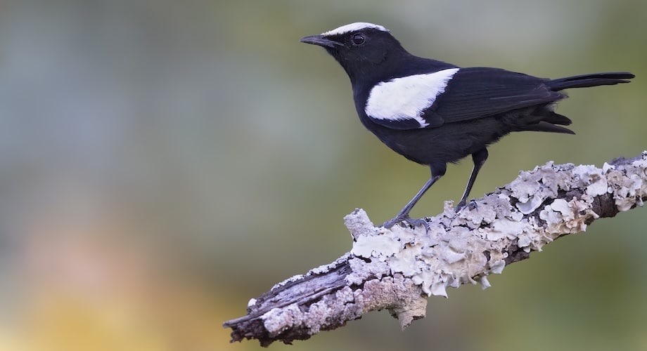 Species AccountChunky black chat with a huge white wing patch. The male has a white cap, and the female a messy white throat patch. -