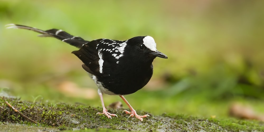 Species AccountLong-tailed, black-and-white chat. Note the mostly white outer tail. Found in thick woodland on rocky hillsides, where it is elusive and skulky. -