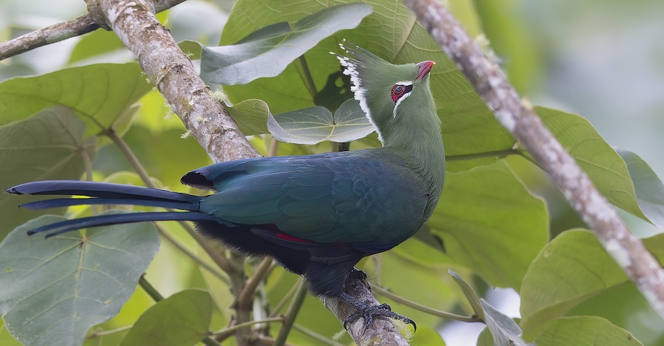 A spectacular green turaco with a bushy crest. There are two white marks on the face, though these vary geographically in size.