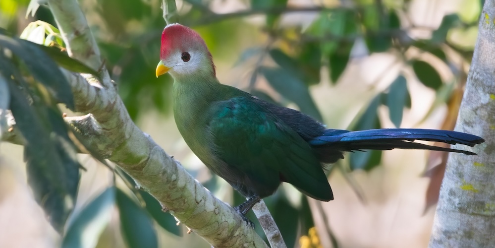 A small green turaco with a yellow bill that inhabits lowland forests in West and Central Africa.