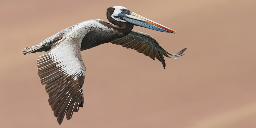 They are characterised by a long beak and a large throat pouch used for catching prey and draining water from the scooped-up contents before swallowing. They have predominantly pale plumage, the exceptions being the brown and Peruvian pelicans. The bills, pouches and bare facial skin of all species become brightly coloured before the breeding season. The eight living pelican species have a patchy global distribution, ranging latitudinally from the tropics to the temperate zone, though they are absent from interior South America as well as from polar regions and the open ocean. However, at least one species is known to migrate to the inland desert of Australia’s Red Centre, after heavy rains create temporary lakes. White pelicans are also observed at the American state of Utah’s Great Salt Lake, for example, some 600 miles (965 km) from the nearest coastline (the Pacific West Coast). They have also been seen hundreds of miles inland in North America, having flown northwards along the Mississippi River and other large waterways.