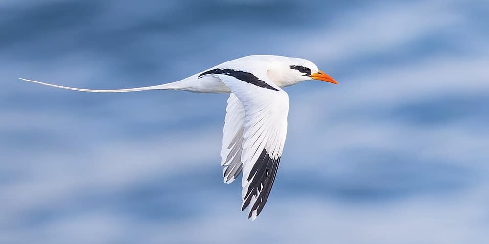 The three species of Tropicbird are usually to be found wandering the tropical oceans. They are very distinctive white birds with two long tail streamers.