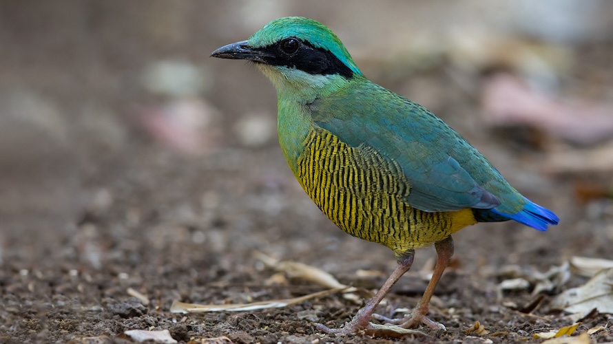 Species AccountJade-green pitta with densely striped, green underparts and a black mask. Male has an aquamarine-blue patch on the back of the crown and a dark purplish-blue... -