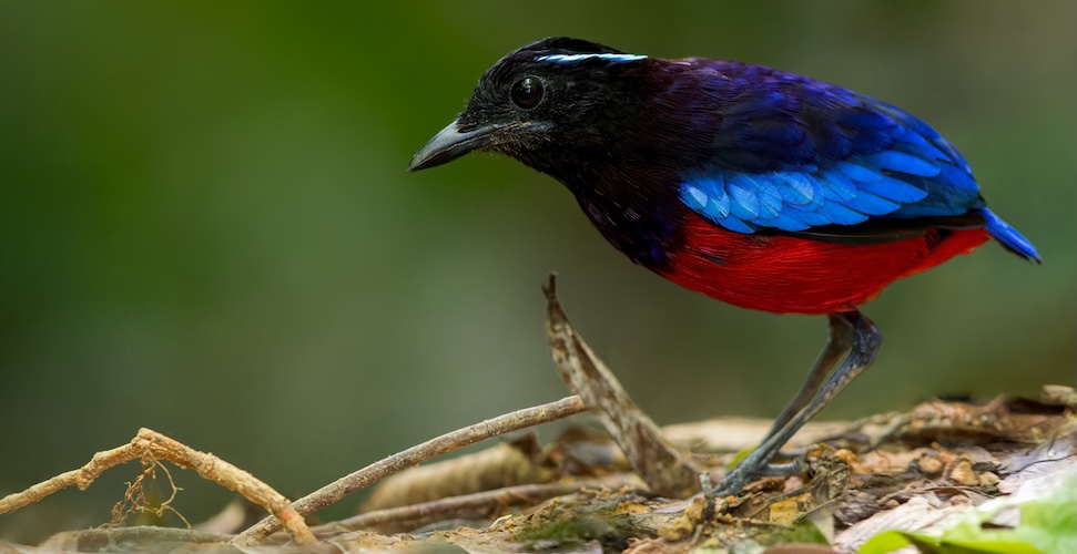 Species AccountDazzling pitta of Borneo's lowland dipterocarp forests. Midnight blue above and blinding scarlet below, with a dark head, bright blue wing coverts. -