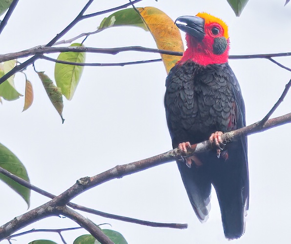 Species AccountA “grail bird” of many birders visiting Borneo, this unique and unmistakable bird with an incandescent head looks like a cross between a small crow and a brightly-colored tube sock. Dark and heavy hooked bill gives it a top-heavy appearance. Often encountered in small flocks as it hops about in the canopy of primary dipterocarp and peatswamp forest in lowland and foothill areas. Vocal, frequently giving bursts of chattering notes, as well as nasal whines and whistles. -