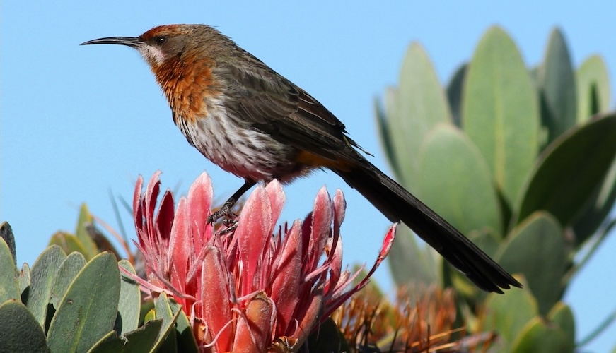 Sugarbirds are dependent on Protea and are found in protea scrub. The Cape Sugarbird is found in fynbos and has also moved into gardens and nurseries.