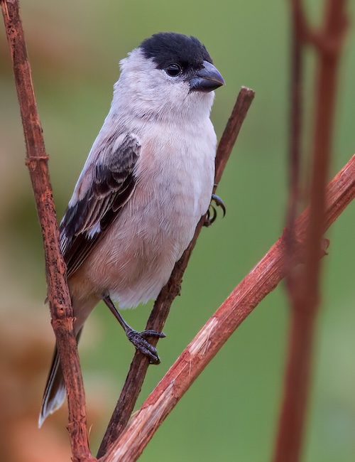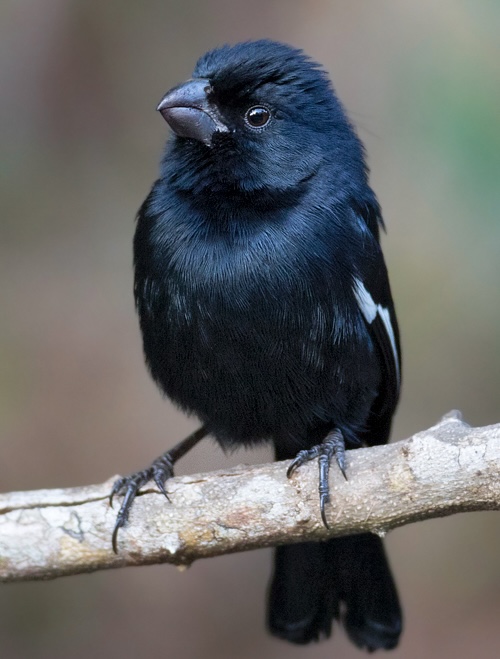 Species AccountSmall nondescript finchlike bird found at humid forest edges and in shrubby and grassy areas. Males are sooty black with a gray bill. -