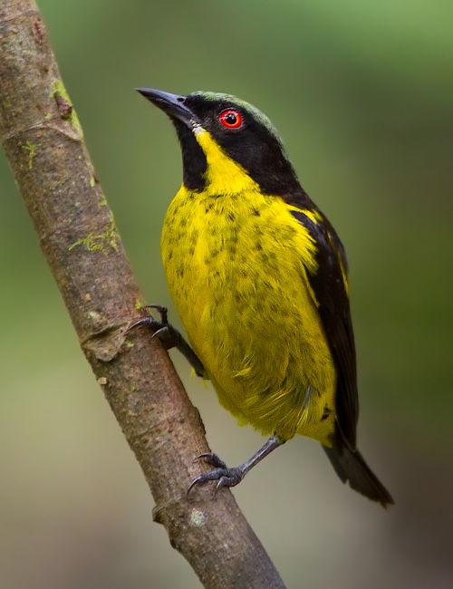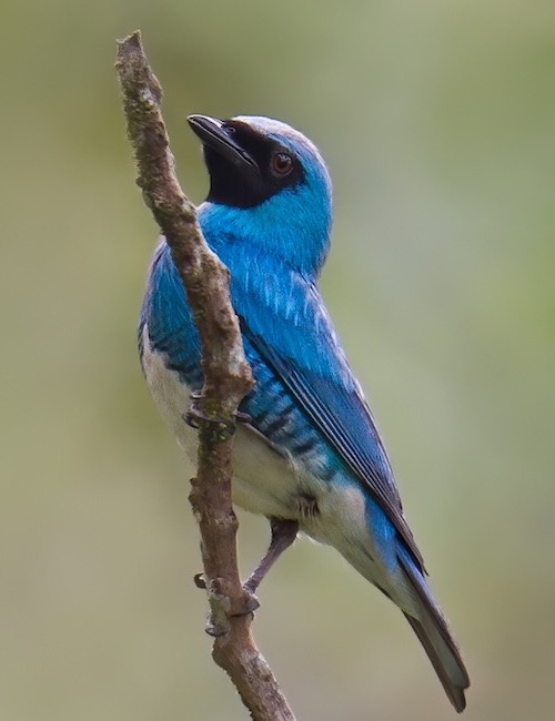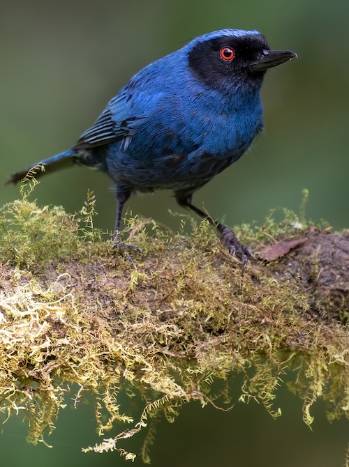 Species AccountFairly large flowerpiercer, almost all blue with black mask and red eye. Feeds on fruit, nectar, and insects. -
