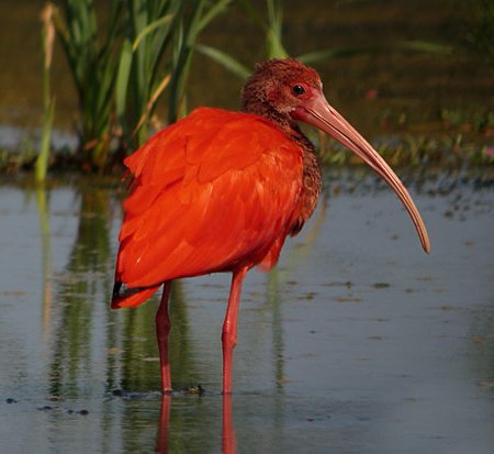 Species AccountThe scarlet ibis (Eudocimus ruber) is a species of ibis in the bird family Threskiornithidae. It inhabits tropical South America and islands of the Caribbean. In form it resembles most of the other twenty-seven extant species of ibis, but its remarkably brilliant scarlet coloration makes it unmistakable. It is 1 of 2 national birds of Trinidad and Tobago. -