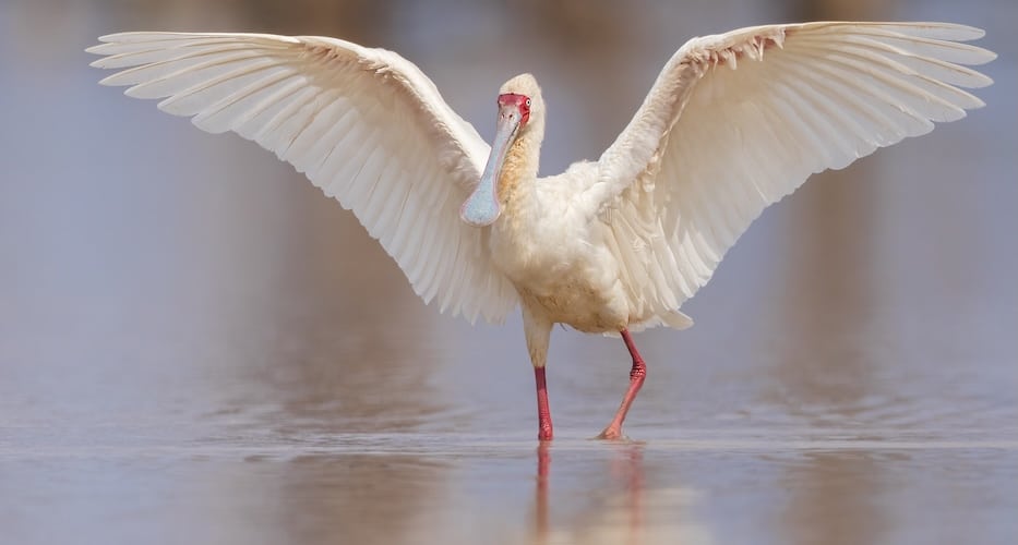 Species AccountA distinctive pale waterbird with long pink-red legs, a bare bright pink-red face, and an odd and distinctive spoon-shaped bill that is obvious even in flight. -