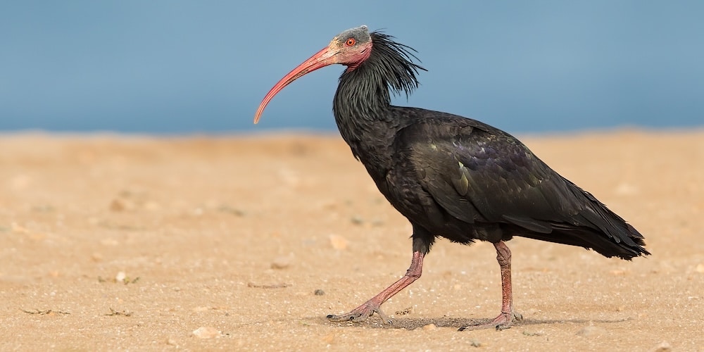 Species AccountThe northern bald ibis, hermit ibis, or waldrapp (Geronticus eremita) is a migratory bird found in barren, semi-desert or rocky habitats, often close to running water. This 70–80 cm (28–31 in) glossy black ibis, which, unlike other members of the ibis family, is non-wading, has an unfeathered red face and head, and a long, curved red bill. It breeds colonially on coastal or mountain cliff ledges, where it typically lays two to three eggs in a stick nest, and feeds on lizards, insects, and other small animals. -