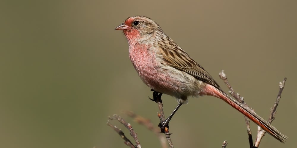 Przewalski’s Finch is a small bird similar in appearance to the Long-tailed Rosefinch. The tail is long and, quite unlike in typical finches, graduated, with the outer feathers much shorter than the central ones. They are sexually dimorphic, with the males having bright pink on the throat, breast and belly. Both sexes have brown streaked plumage on the back and wings. The bill is thinner than those of the rosefinches. The morphological feature which is diagnostic for the Urocynchramidae is the outer primary; in finches and buntings this feather is vestigial but in the Przewalski’s finch it is two-thirds the length of the next primary.